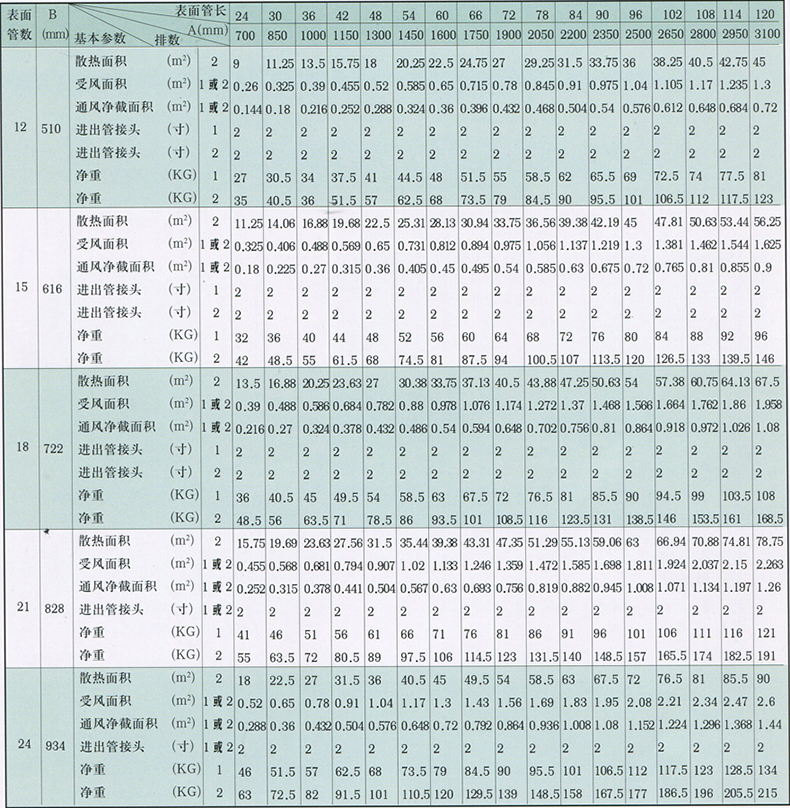 UⅡ型蒸汽散熱器有各種不同表面管長、管數(shù)、排數(shù)及翅片片距的多種配合,計(jì)有大小規(guī)格七百六十五種。